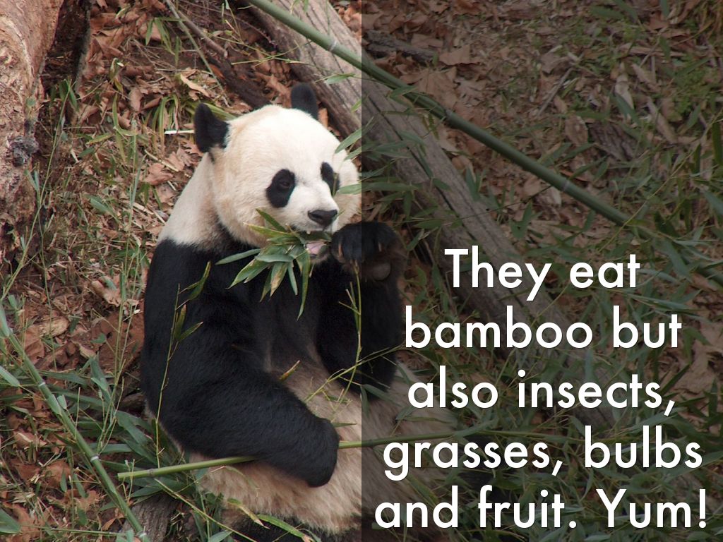 They eat bamboo but also insects, grasses, bulbs and fruit. Yum!