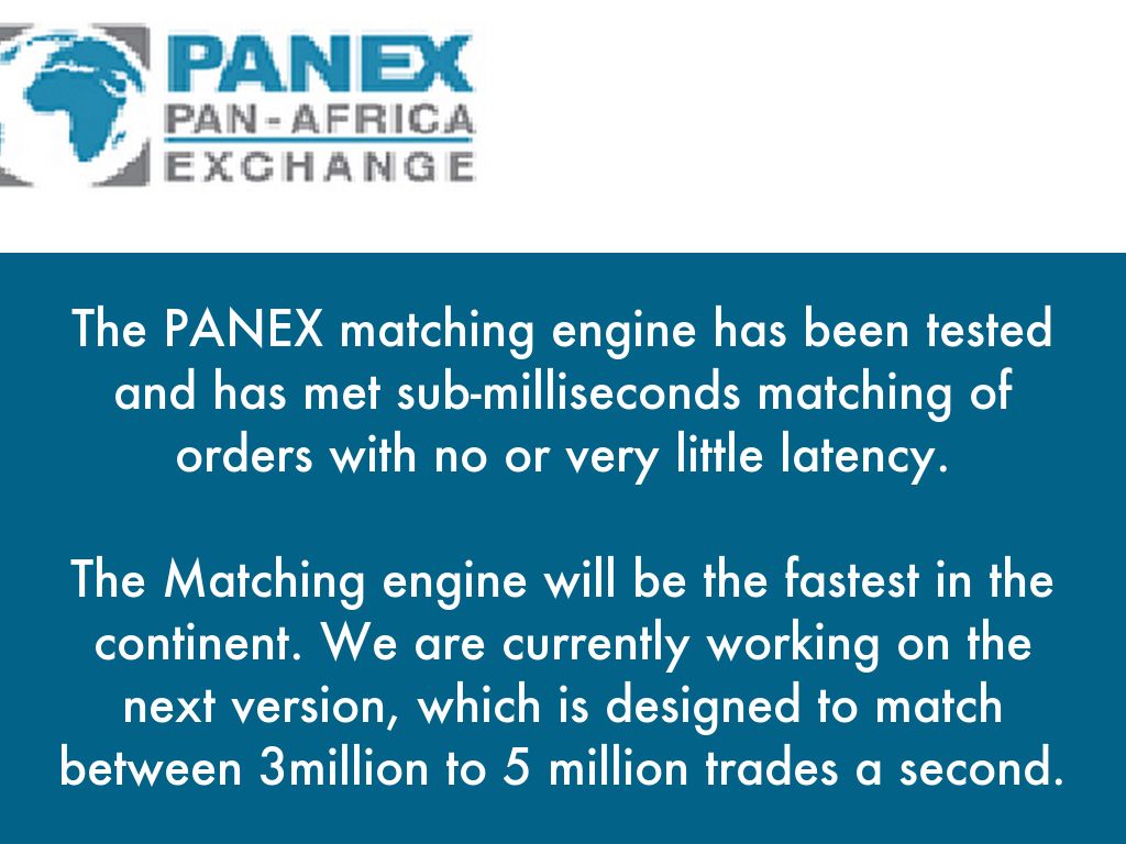 The PANEX matching engine is used to match trades as it implies. The matching engine is powerful software that runs and does complex calculation on how orders are going to be matched. It provides price discovery and then broadcasts the prices to the general public through a feed.