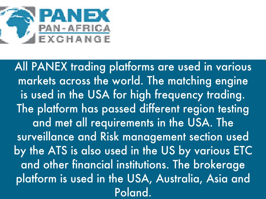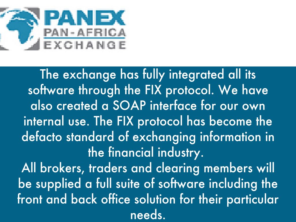 We have realized over the past several years that front; middle and back office systems are very important infrastructure segments and yet expensive for individual brokers to buy. The exchange has acquired licenses that will be distributed to the brokers as a turnkey solution. PANEX trader is the Brokerage trading platform. The platform is a fully electronic system, which is Internet and client ready.