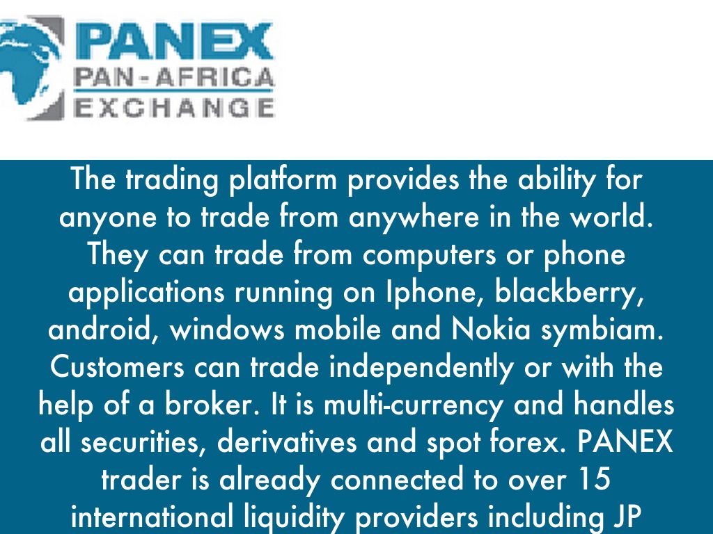 The trading platform provides the ability for anyone to trade from anywhere in the world. They can trade from computers or phone applications running on Iphone, blackberry, android, windows mobile and Nokia symbiam. Customers can trade independently or with the help of a broker. It is multi-currency and handles all securities, derivatives and spot forex. PANEX trader is already connected to over 15 international liquidity providers including JP Morgan, Saxo bank etc. The brokerage platform is linked to the clearing member and clearinghouse via Fix.