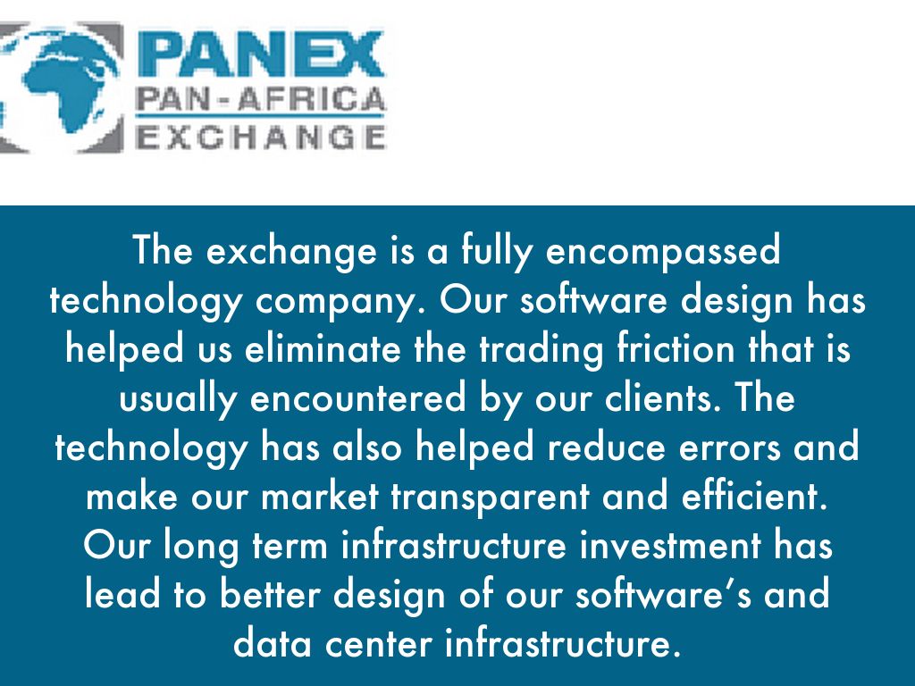 PANEX is commercially viable and profitable. The exchange is fully electronic with servers located in New York, London and Nairobi. The exchange operates a hub and spokes or white label franchise models. PANEX has installed one trading Platform that is utilized in all countries and regional exchanges.