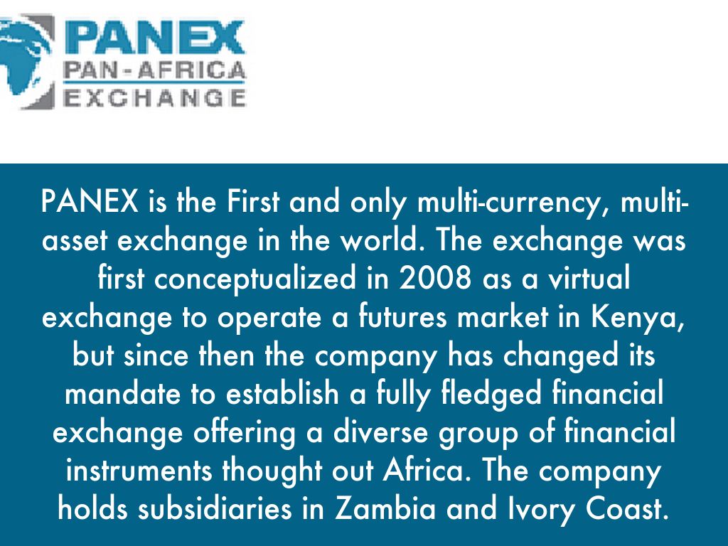 PANEX is the First and only multi-currency, multi-asset exchange in the world. The exchange was first conceptualized in 2008 as a virtual exchange to operate a futures market in Kenya, but since then the company has changed its mandate to establish a fully fledged financial exchange offering a diverse group of financial instruments thought out Africa. The company holds subsidiaries in Zambia and Ivory Coast.