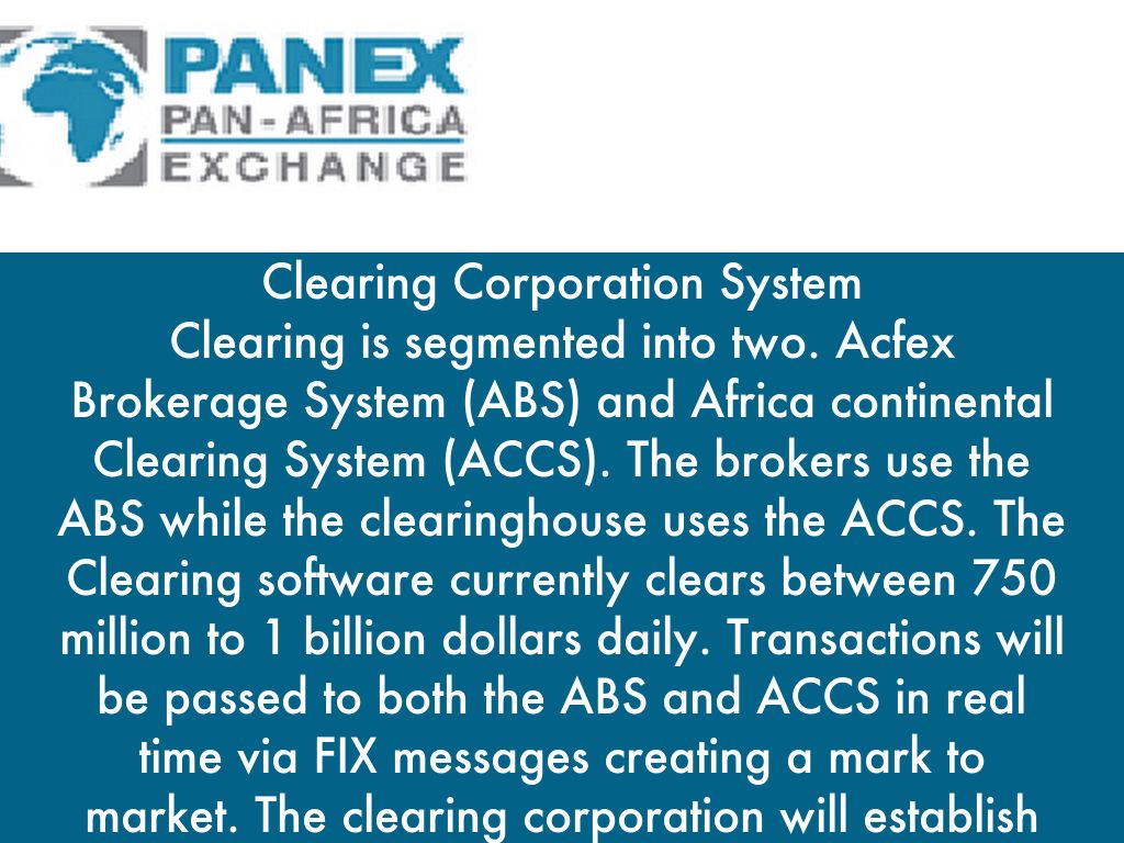 Clearing is segmented into two. Acfex Brokerage System (ABS) and Africa continental Clearing System (ACCS). The brokers use the ABS while the clearinghouse uses the ACCS. The Clearing software currently clears between 750 million to 1 billion dollars daily. Transactions will be passed to both the ABS and ACCS in real time via FIX messages creating a mark to market. The clearing corporation will establish the Initial and variation margin on real-time and end of day basis.