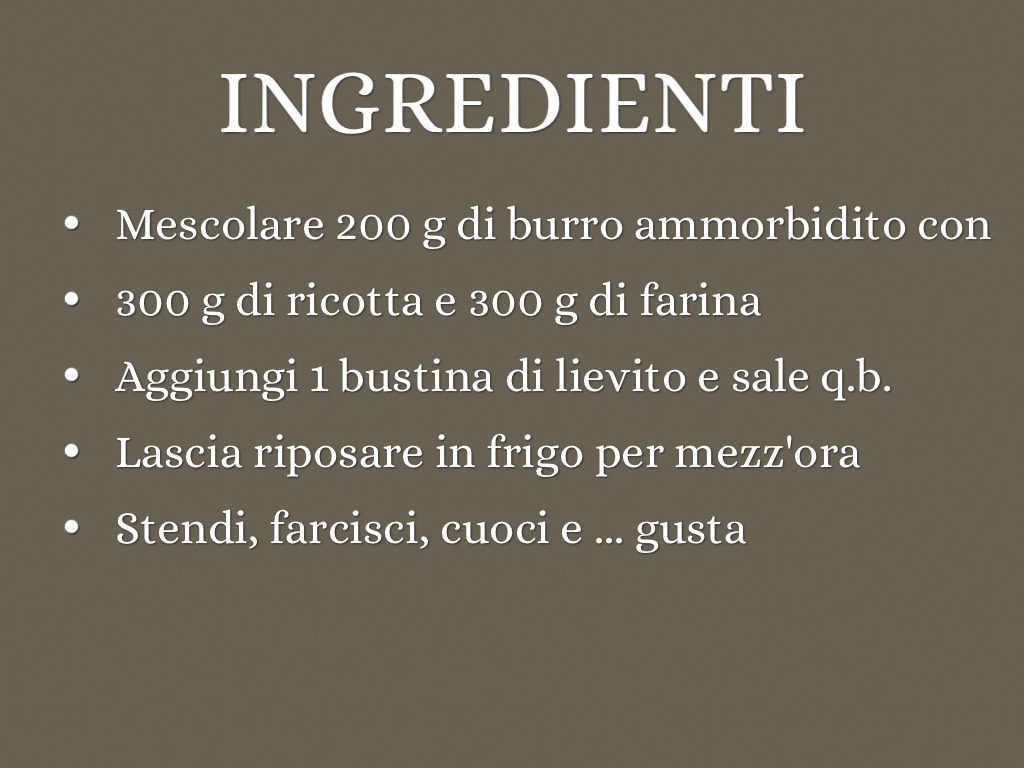 Lavorare il burro aggiungere la ricotta, la farina, il lievito, il sale.