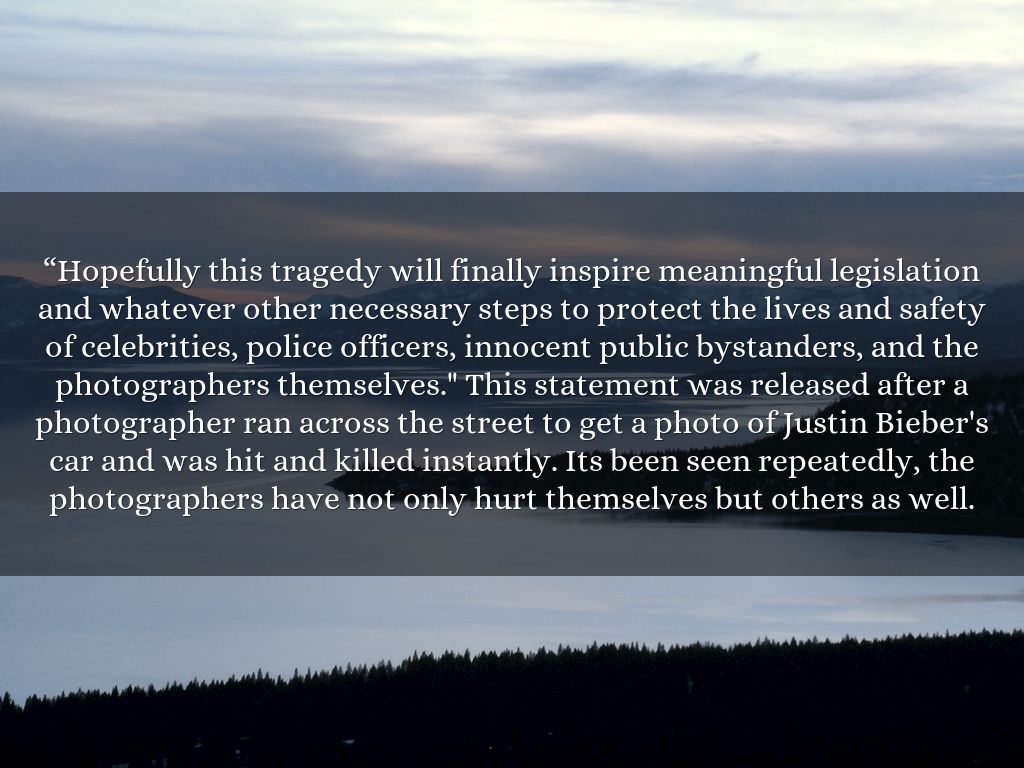 “Hopefully this tragedy will finally inspire meaningful legislation and whatever other necessary steps to protect the lives and safety of celebrities, police officers, innocent public bystanders, and the photographers themselves." This statement was released after a photographer ran across the street to get a photo of Justin Bieber's car and was hit and killed instantly. Its been seen repeatedly, the photographers have not only hurt themselves but others as well.