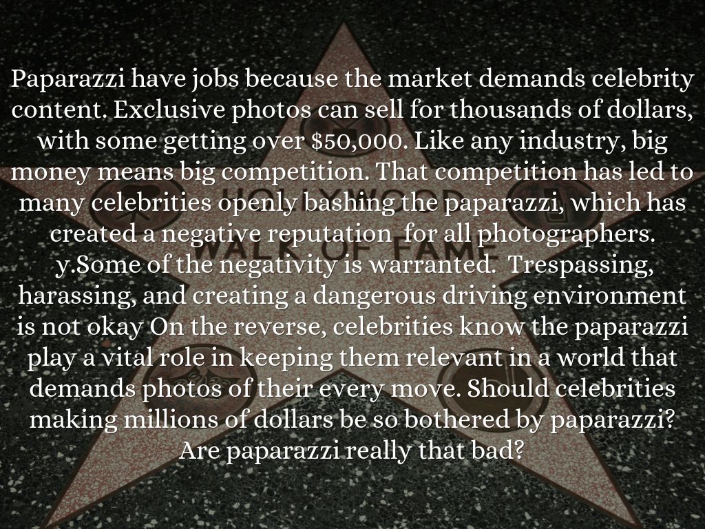 Paparazzi have jobs because the market demands celebrity content. Exclusive photos can sell for thousands of dollars, with some getting over $50,000. Like any industry, big money means big competition. That competition has led to many celebrities openly bashing the paparazzi, which has created a negative reputation for all photographers. y.Some of the negativity is warranted. Trespassing, harassing, and creating a dangerous driving environment is not okay On the reverse, celebrities know the paparazzi play a vital role in keeping them relevant in a world that demands photos of their every move. Should celebrities making millions of dollars be so bothered by paparazzi? Are paparazzi really that bad?