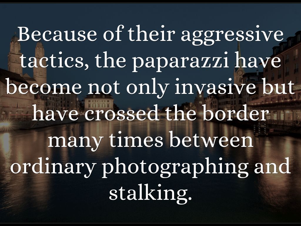 Because of their aggressive tactics, the paparazzi have become not only invasive but have crossed the border many times between ordinary photographing and stalking.