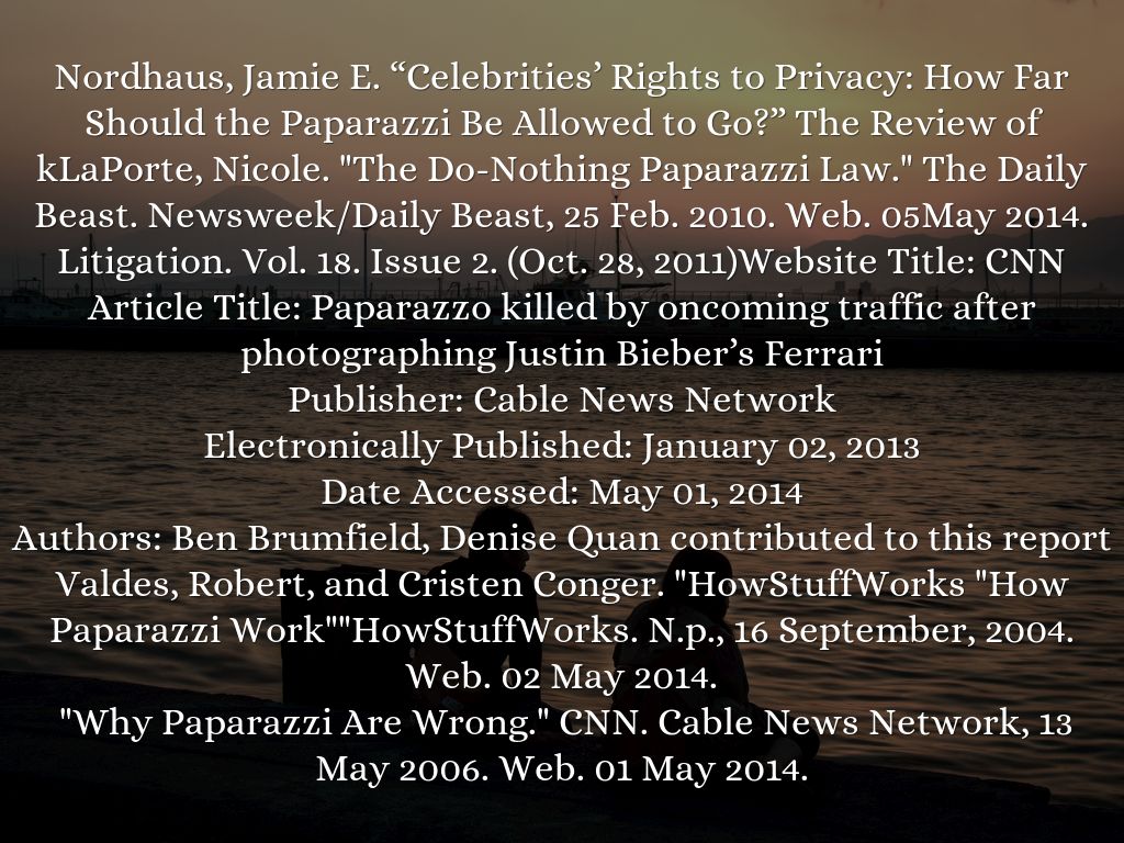 Nordhaus, Jamie E. “Celebrities’ Rights to Privacy: How Far Should the Paparazzi Be Allowed to Go?” The Review of kLaPorte, Nicole. "The Do-Nothing Paparazzi Law." The Daily Beast. Newsweek/Daily Beast, 25 Feb. 2010. Web. 05May 2014. Litigation. Vol. 18. Issue 2. (Oct. 28, 2011)Website Title: CNN Article Title: Paparazzo killed by oncoming traffic after photographing Justin Bieber’s Ferrari Publisher: Cable News Network Electronically Published: January 02, 2013 Date Accessed: May 01, 2014 Authors: Ben Brumfield, Denise Quan contributed to this report Valdes, Robert, and Cristen Conger. "HowStuffWorks "How Paparazzi Work""HowStuffWorks. N.p., 16 September, 2004. Web. 02 May 2014. "Why Paparazzi Are Wrong." CNN. Cable News Network, 13 May 2006. Web. 01 May 2014.