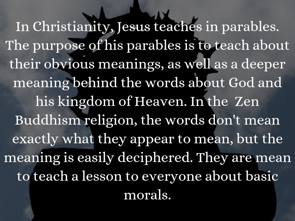 In Christianity, Jesus teaches in parables. The purpose of his parables is to teach about their obvious meanings, as well as a deeper meaning behind the words about God and his kingdom of Heaven. In the Zen Buddhism religion, the words don't mean exactly what they appear to mean, but the meaning is easily deciphered. They are mean to teach a lesson to everyone about basic morals.
