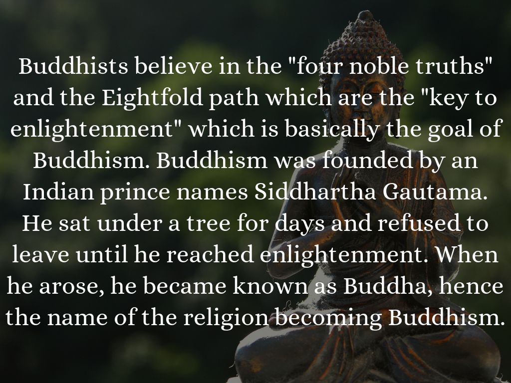 Buddhists believe in the "four noble truths" and the Eightfold path which are the "key to enlightenment" which is basically the goal of Buddhism. Buddhism was founded by an Indian prince names Siddhartha Gautama. He sat under a tree for days and refused to leave until he reached enlightenment. When he arose, he became known as Buddha, hence the name of the religion becoming Buddhism.