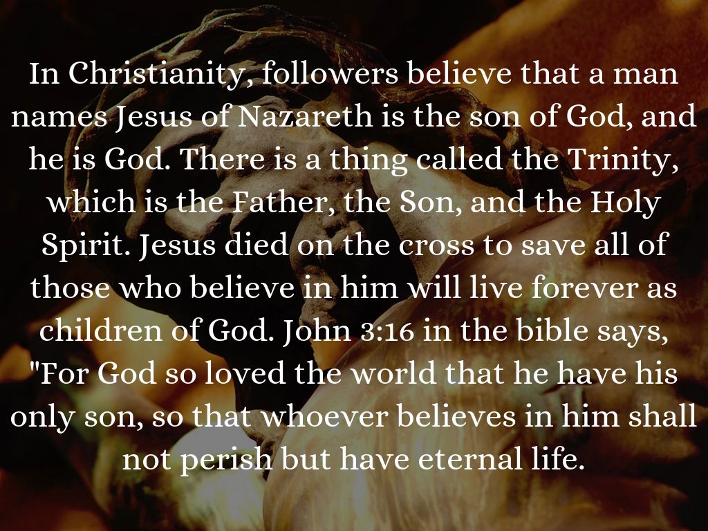 In Christianity, followers believe that a man names Jesus of Nazareth is the son of God, and he is God. There is a thing called the Trinity, which is the Father, the Son, and the Holy Spirit. Jesus died on the cross to save all of those who believe in him will live forever as children of God. John 3:16 in the bible says, "For God so loved the world that he have his only son, so that whoever believes in him shall not perish but have eternal life.