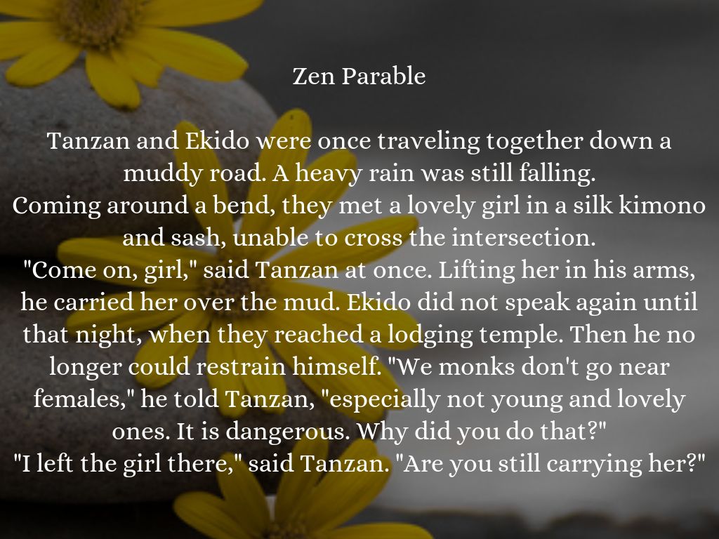 Tanzan and Ekido were once traveling together down a muddy road. A heavy rain was still falling.