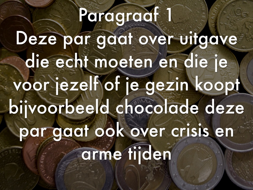 Deze par gaat over uitgave die echt moeten en die je voor jezelf of je gezin koopt bijvoorbeeld chocolade deze par gaat ook over crisis en arme tijden