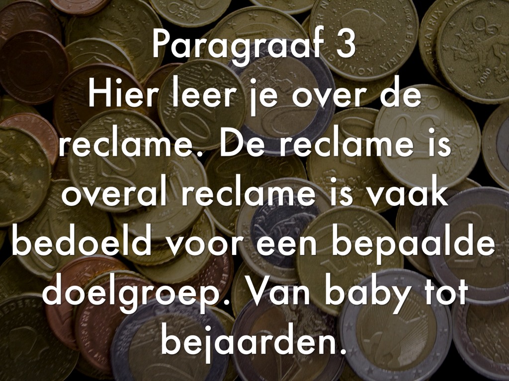 Hier leer je over de reclame. De reclame is overal reclame is vaak bedoeld voor een bepaalde doelgroep. Van baby tot bejaarden.