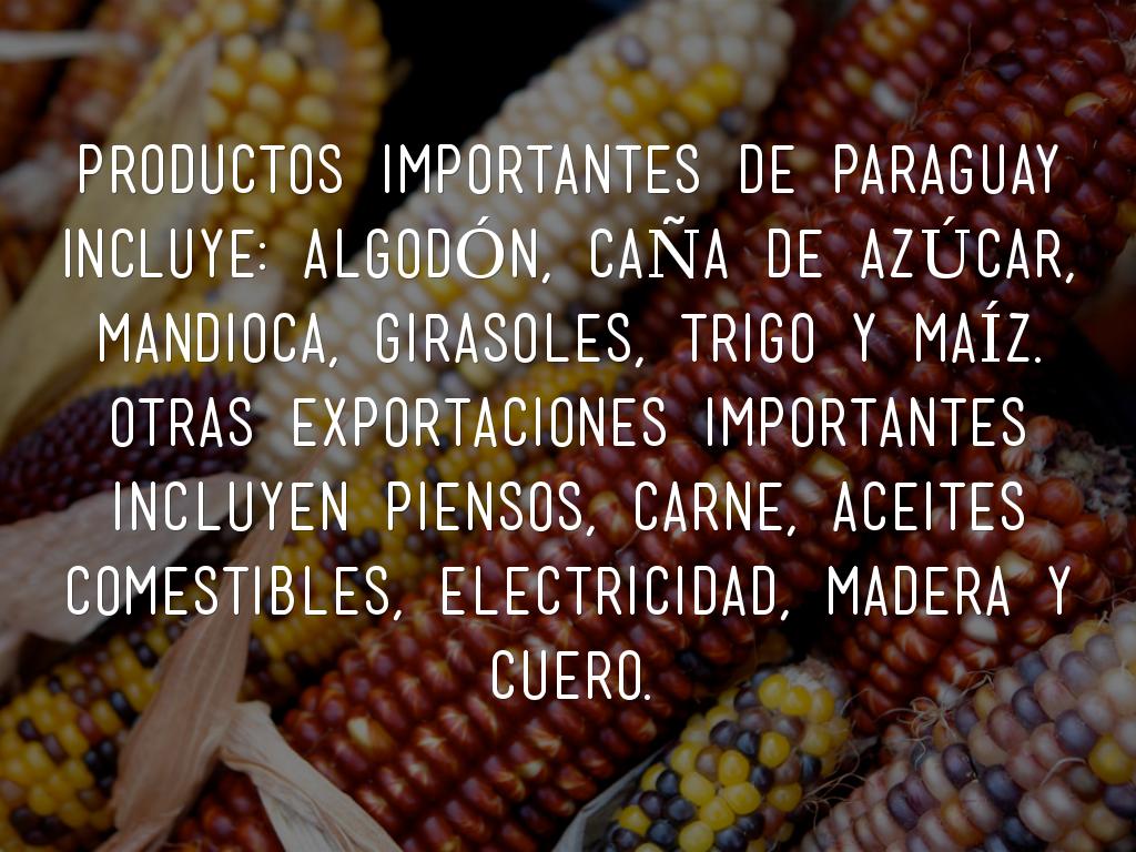 Productos importantes de paraguay Incluye: ALGODÓN, CAÑA DE AZÚCAR, MANDIOCA, GIRASOLES, TRIGO Y MAÍZ. OTRAS EXPORTACIONES IMPORTANTES INCLUYEN PIENSOS, CARNE, ACEITES COMESTIBLES, ELECTRICIDAD, MADERA Y CUERO.