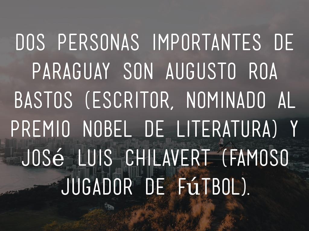 Dos personas importantes de Paraguay son Augusto Roa Bastos (escritor, nominado al Premio Nobel de literatura) y José Luis Chilavert (famoso jugador de fútbol).