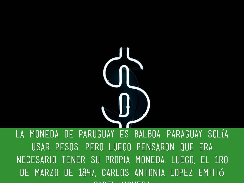 la moneda de paruguay es balboa. Paraguay solía usar pesos, pero luego pensaron que era necesario tener su propia moneda. Luego, el 1ro de marzo de 1847, carlos antonia lopez emitió papel moneda