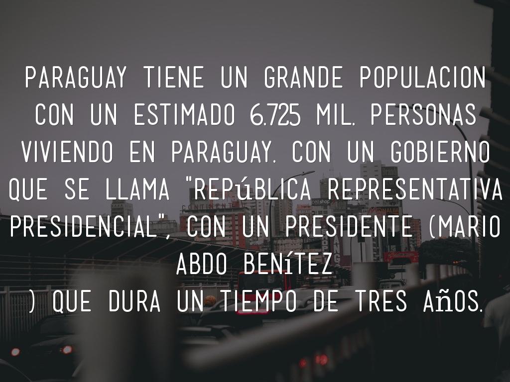 Paraguay tiene un grande populacion con un estimado 6.725 mil. Personas viviendo en paraguay. con un gobierno que se llama "república representativa presidencial", con un presidente (Mario Abdo Benítez ) que dura un tiempo de tres años.