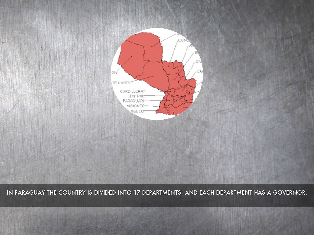 IN PARAGUAY THE COUNTRY IS DIVIDED INTO 17 DEPARTMENTS AND EACH DEPARTMENT HAS A GOVERNOR.