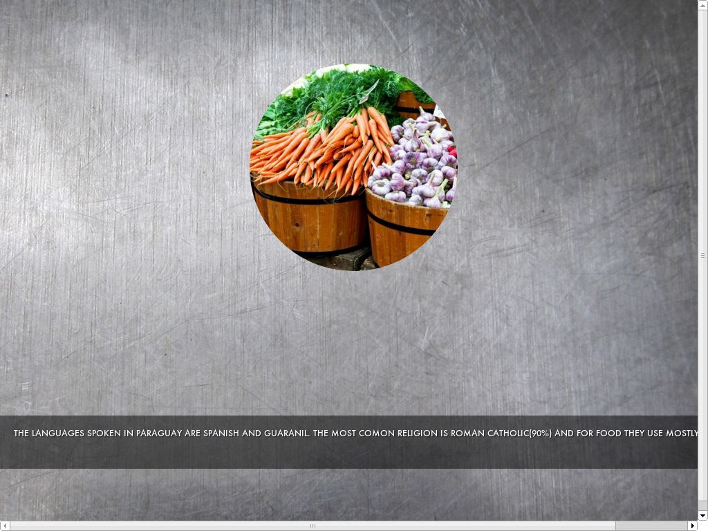 THE LANGUAGES SPOKEN IN PARAGUAY ARE SPANISH AND GUARANIL. THE MOST COMON RELIGION IS ROMAN CATHOLIC(90%) AND FOR FOOD THEY USE MOSTLY FREASH FOODS