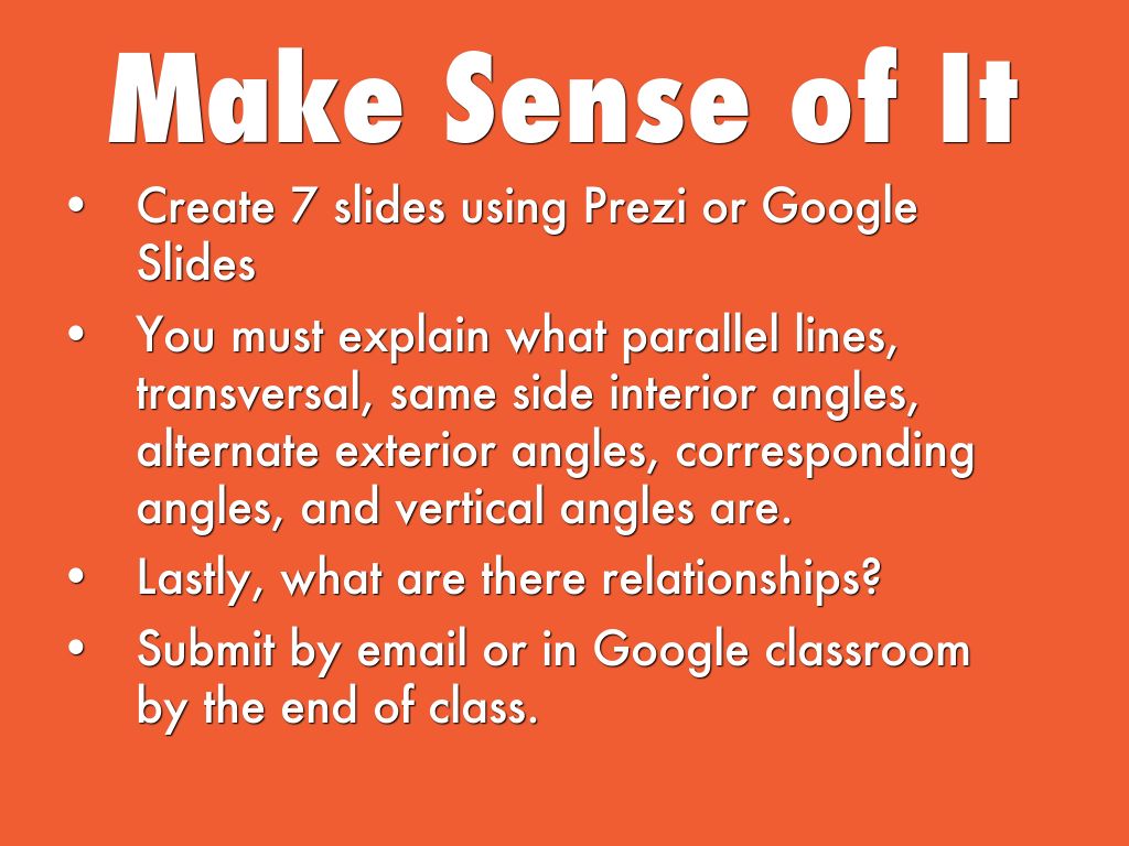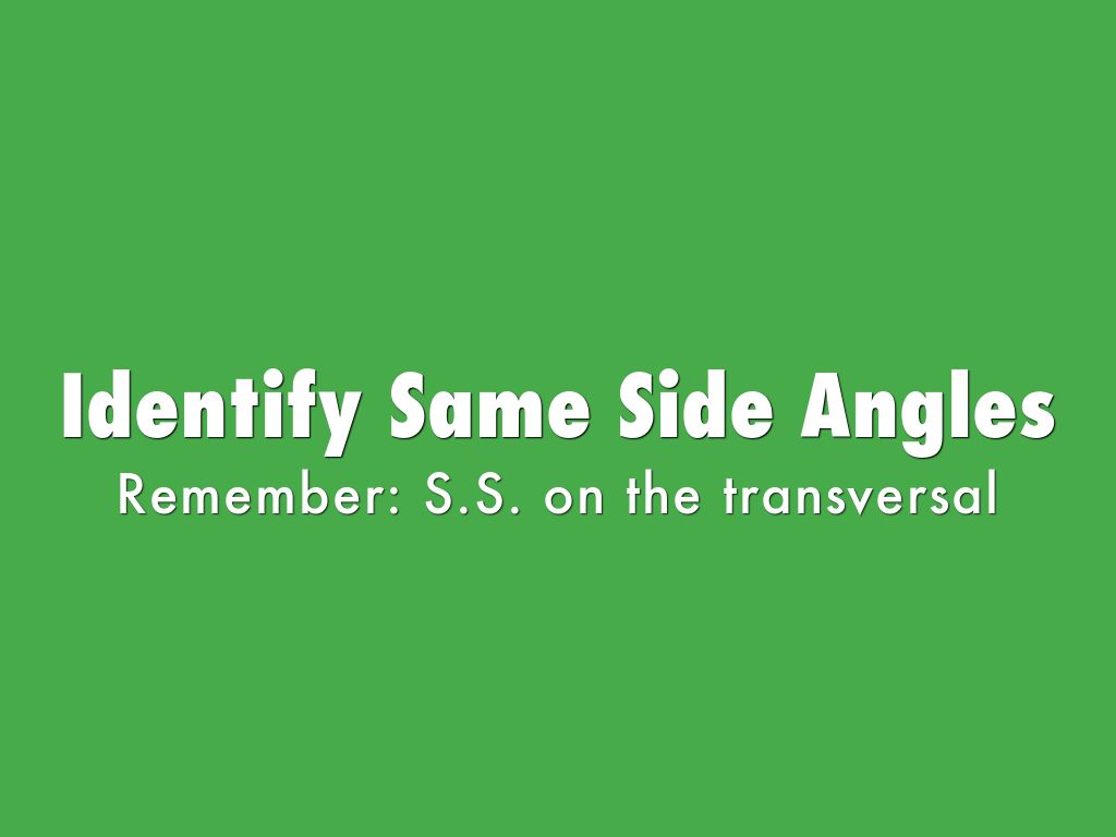 - You must explain what parallel lines, transversal, same side interior angles, alternate exterior angles, corresponding angles, and vertical angles are.