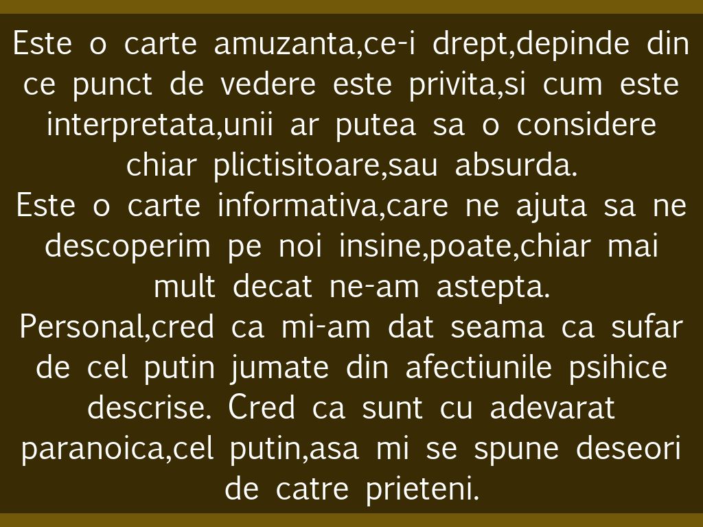 Personal,cred ca mi-am dat seama ca sufar de cel putin jumate din afectiunile psihice descrise. Cred ca sunt cu adevarat paranoica,cel putin,asa mi se spune deseori de catre prieteni.
