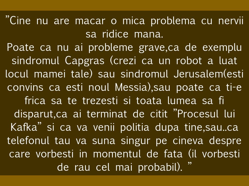 Poate ca nu ai probleme grave,ca de exemplu sindromul Capgras (crezi ca un robot a luat locul mamei tale) sau sindromul Jerusalem(esti convins ca esti noul Messia),sau poate ca ti-e frica sa te trezesti si toata lumea sa fi disparut,ca ai terminat de citit ”Procesul lui Kafka” si ca va venii politia dupa tine,sau..ca telefonul tau va suna singur pe cineva despre care vorbesti in momentul de fata (il vorbesti de rau cel mai probabil). ”