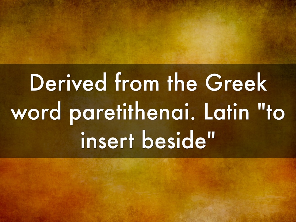 Derived from the Greek word paretithenai. Latin "to insert beside"