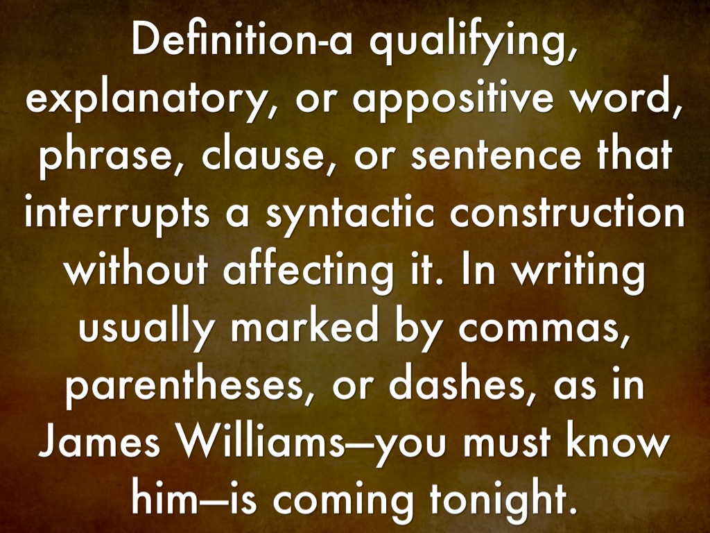 Definition-a qualifying, explanatory, or appositive word, phrase, clause, or sentence that interrupts a syntactic construction without affecting it. In writing usually marked by commas, parentheses, or dashes, as in James Williams—you must know him—is coming tonight.