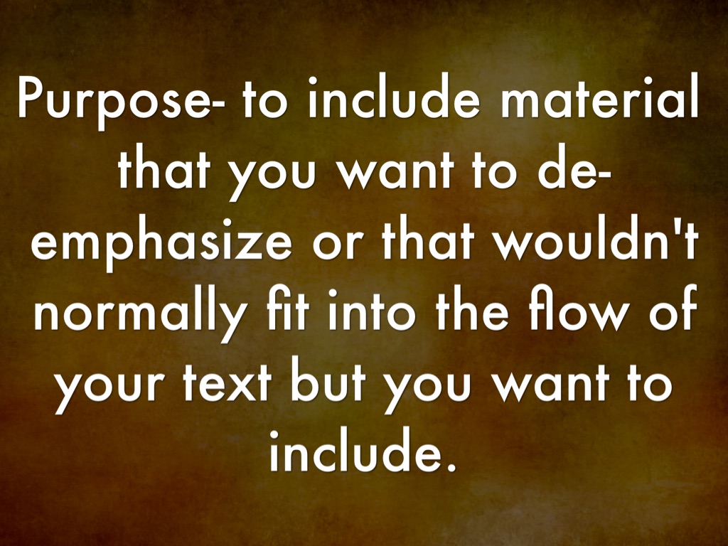 Purpose- to include material that you want to de-emphasize or that wouldn't normally fit into the flow of your text but you want to include.