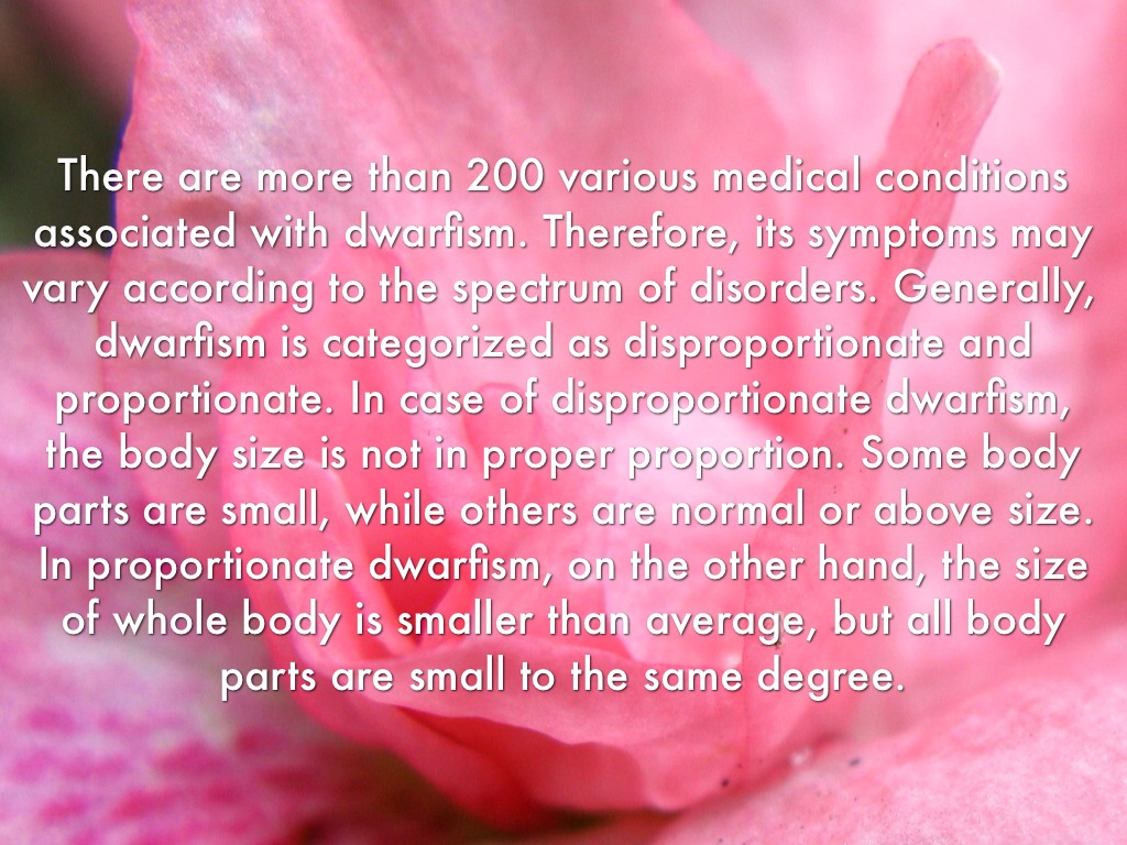 There are more than 200 various medical conditions associated with dwarfism. Therefore, its symptoms may vary according to the spectrum of disorders. Generally, dwarfism is categorized as disproportionate and proportionate. In case of disproportionate dwarfism, the body size is not in proper proportion. Some body parts are small, while others are normal or above size. In proportionate dwarfism, on the other hand, the size of whole body is smaller than average, but all body parts are small to the same degree.