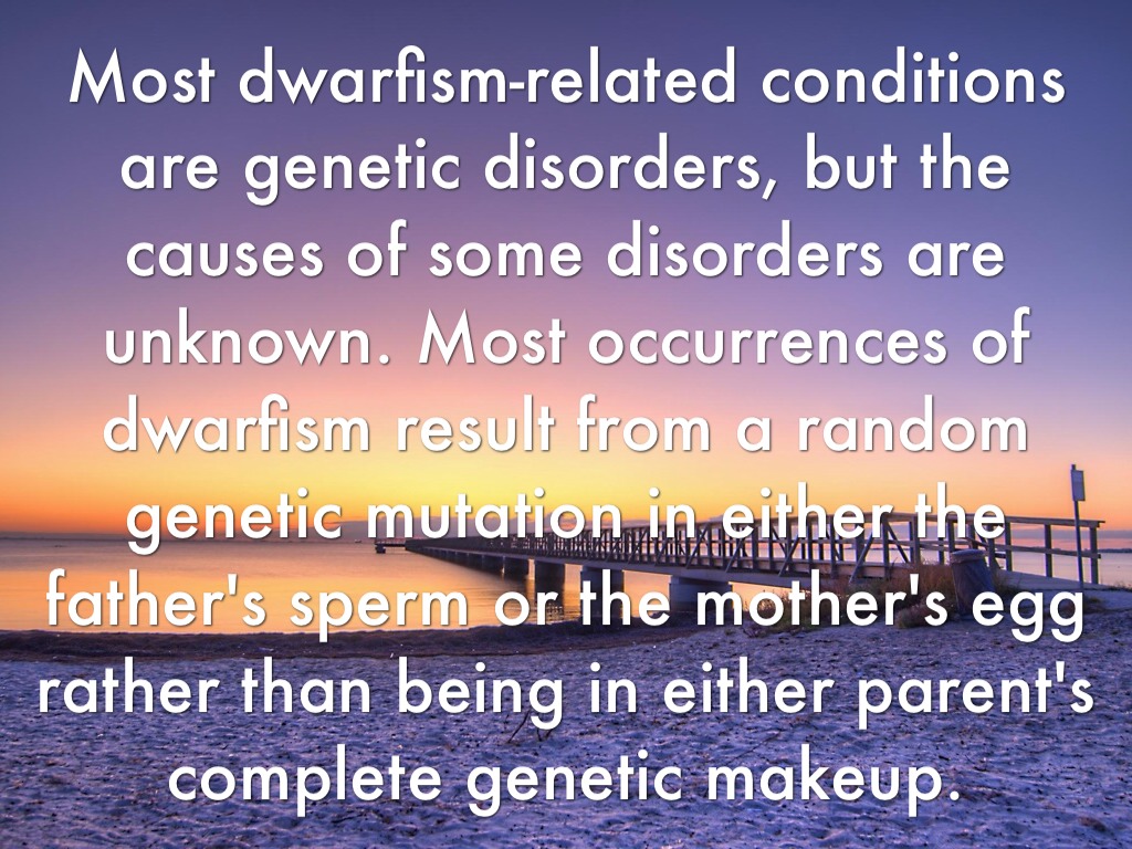 Most dwarfism-related conditions are genetic disorders, but the causes of some disorders are unknown. Most occurrences of dwarfism result from a random genetic mutation in either the father's sperm or the mother's egg rather than being in either parent's complete genetic makeup.