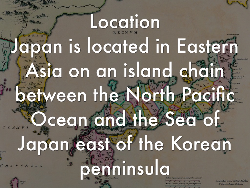 Japan is located in Eastern Asia on an island chain between the North Pacific Ocean and the Sea of Japan east of the Korean penninsula