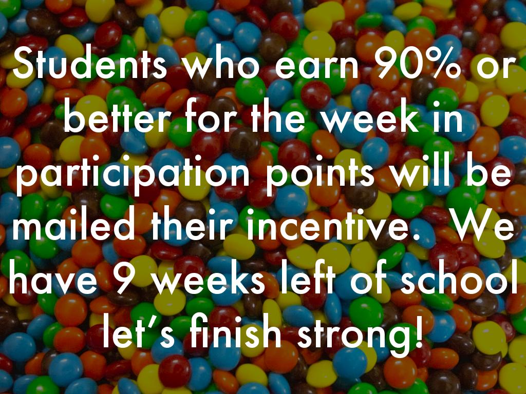 Students who earn 90% or better for the week in participation points will be mailed their incentive. We have 9 weeks left of school let’s finish strong!