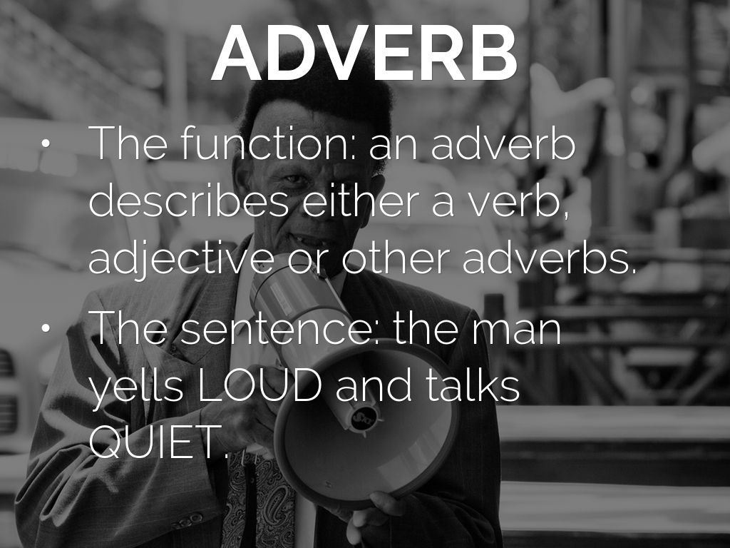 The function: an adverb describes either a verb, adjective or other adverbs.