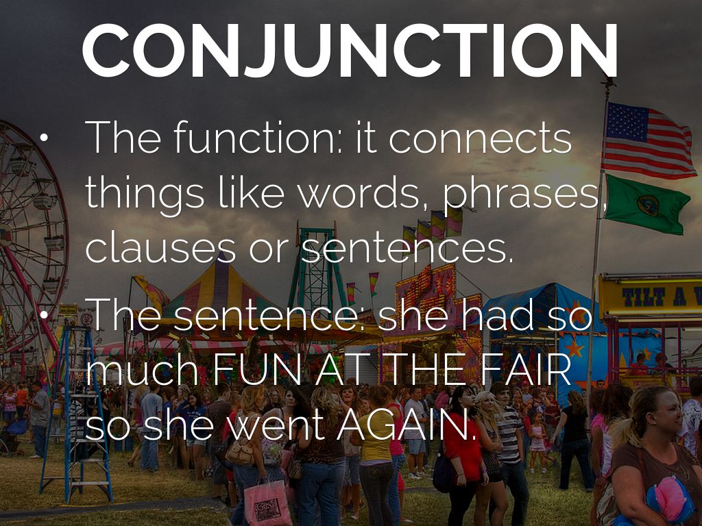 The sentence: she had so much FUN AT THE FAIR so she went AGAIN.