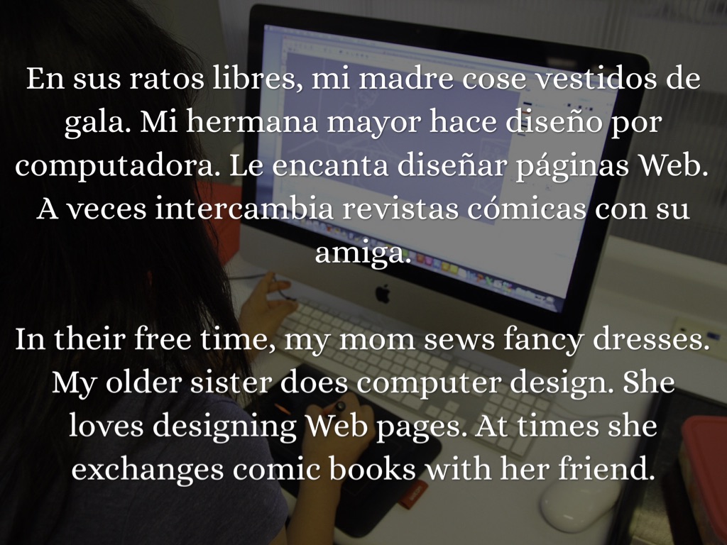 En sus ratos libres, mi madre cose vestidos de gala. Mi hermana mayor hace diseño por computadora. Le encanta diseñar páginas Web. A veces intercambia revistas cómicas con su amiga.