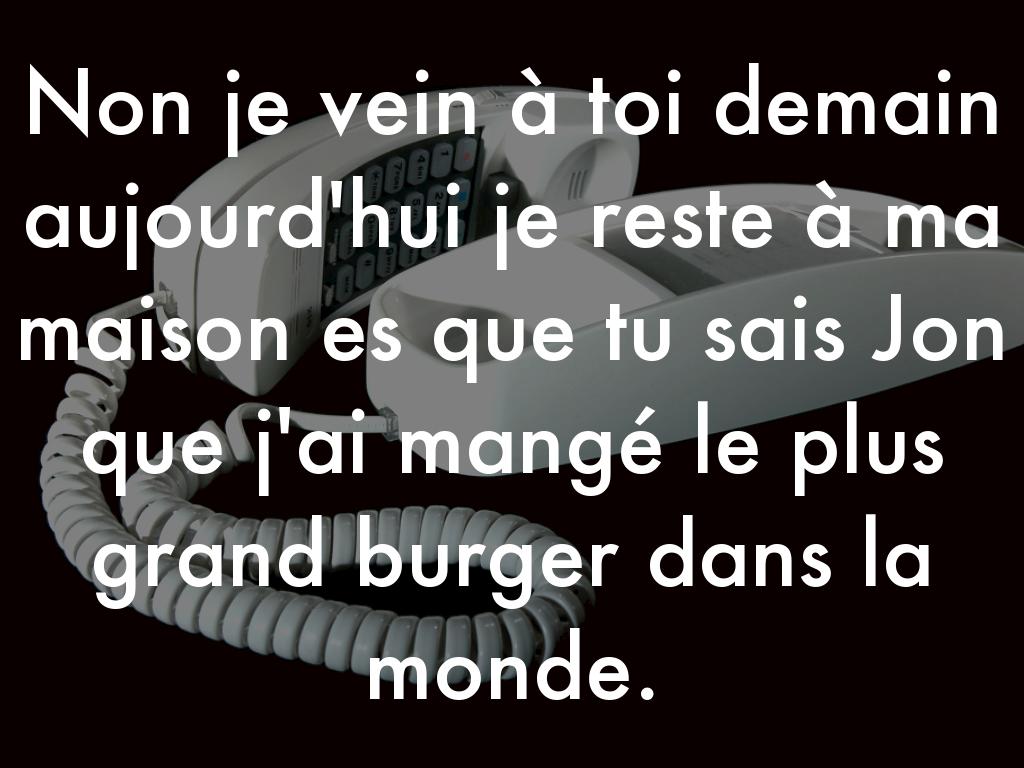 Non je vein à toi demain aujourd'hui je reste à ma maison es que tu sais Jon que j'ai mangé le plus grand burger dans la monde.