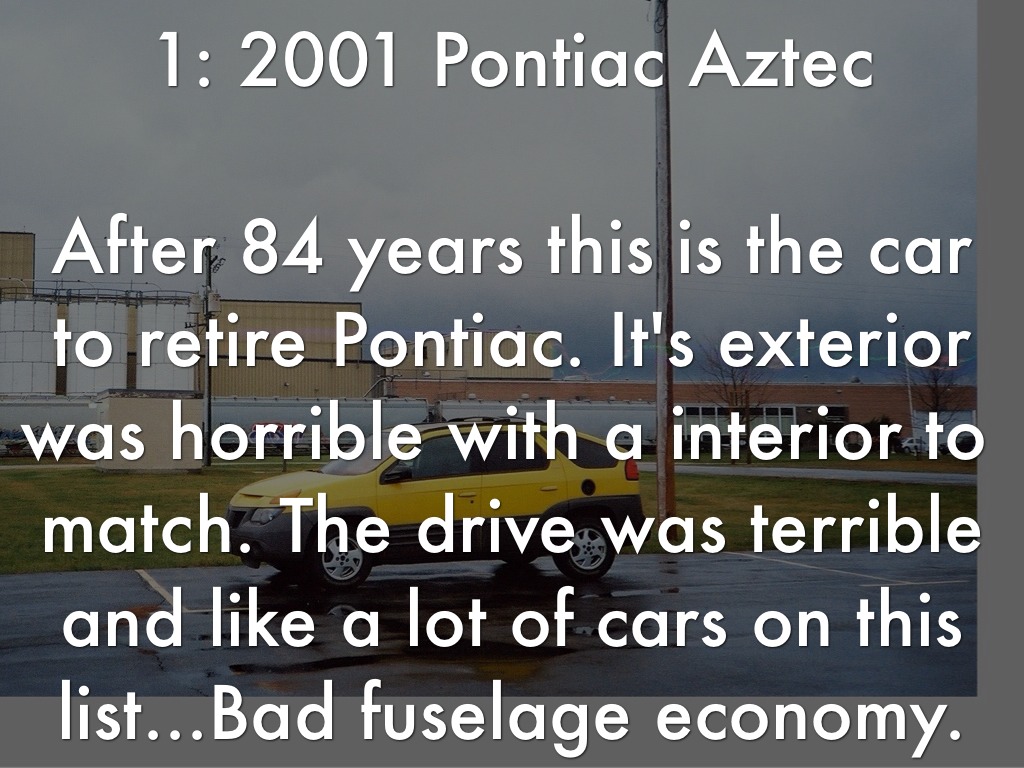 After 84 years this is the car to retire Pontiac. It's exterior was horrible with a interior to match. The drive was terrible and like a lot of cars on this list...Bad fuselage economy.
