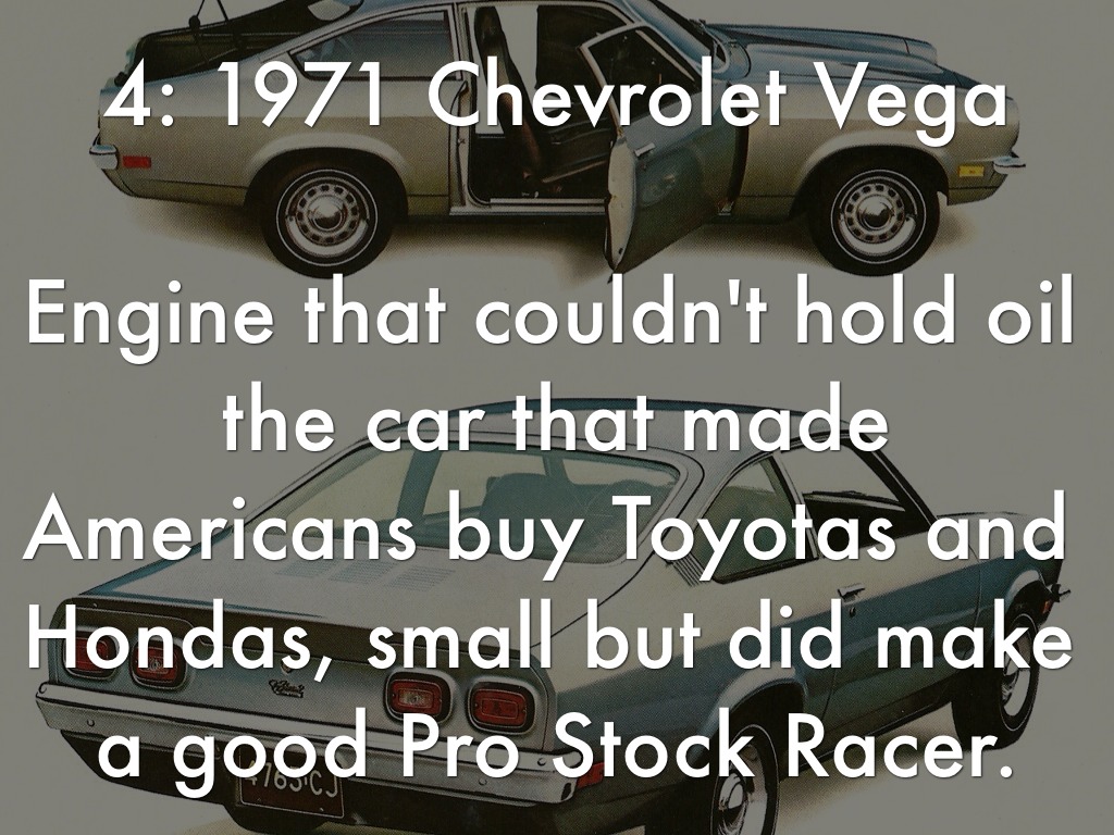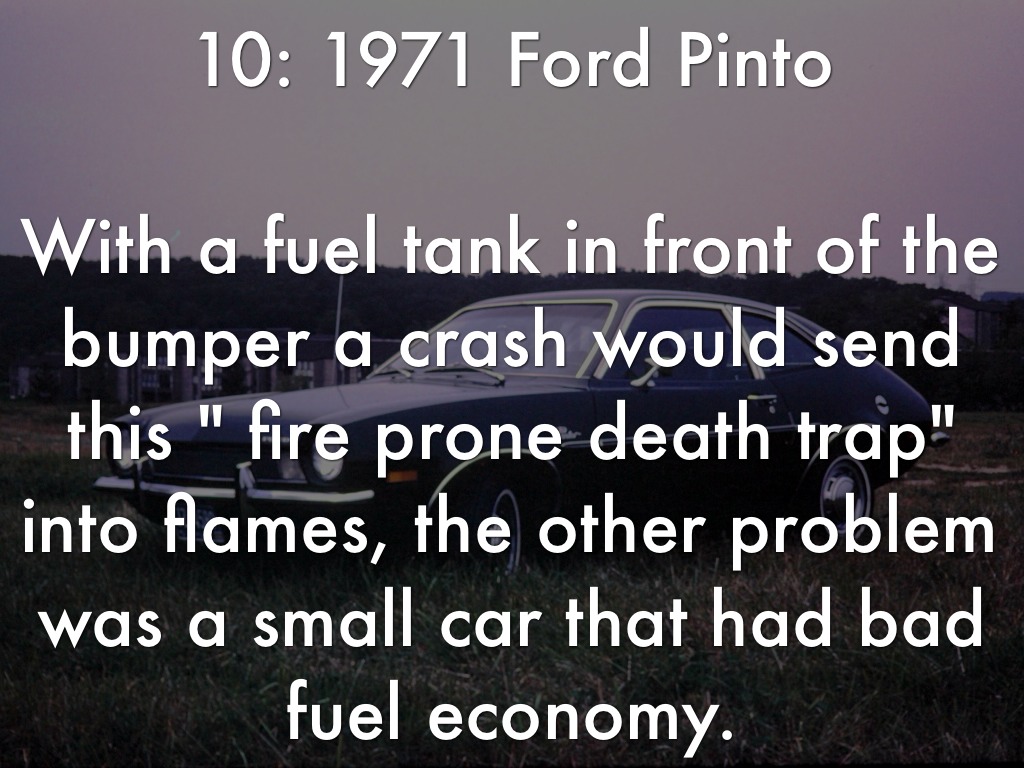 With a fuel tank in front of the bumper a crash would send this " fire prone death trap" into flames, the other problem was a small car that had bad fuel economy.
