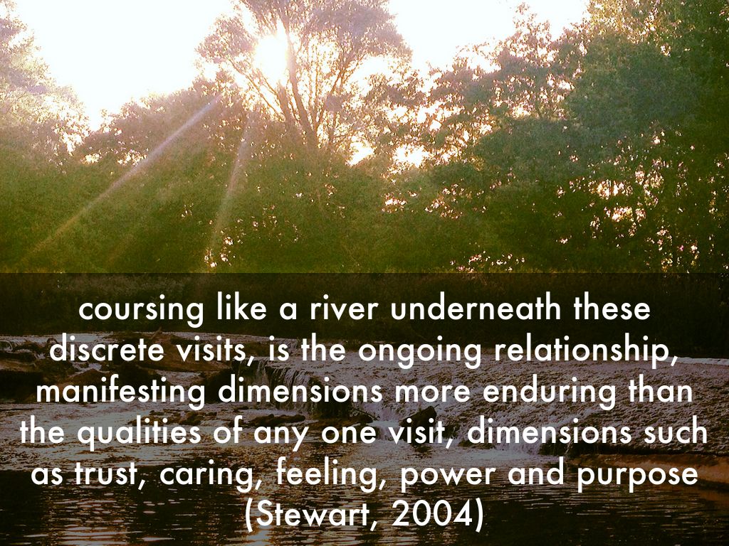 coursing like a river underneath these discrete visits, is the ongoing relationship, manifesting dimensions more enduring than the qualities of any one visit, dimensions such as trust, caring, feeling, power and purpose (Stewart, 2004)