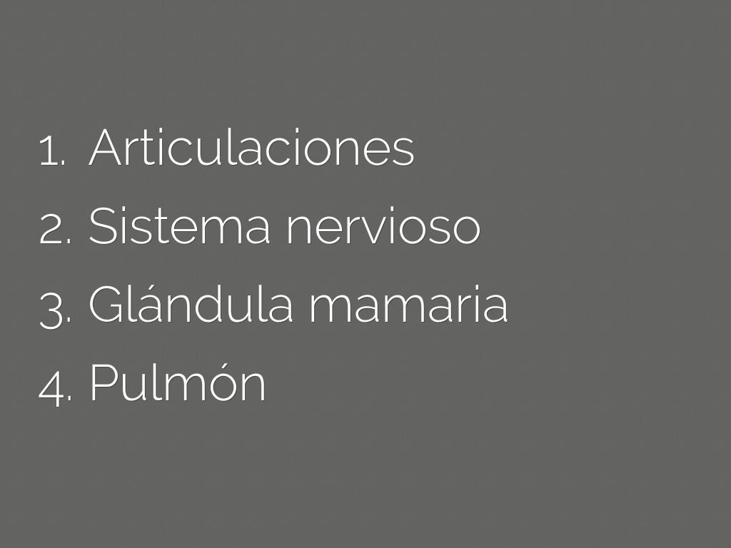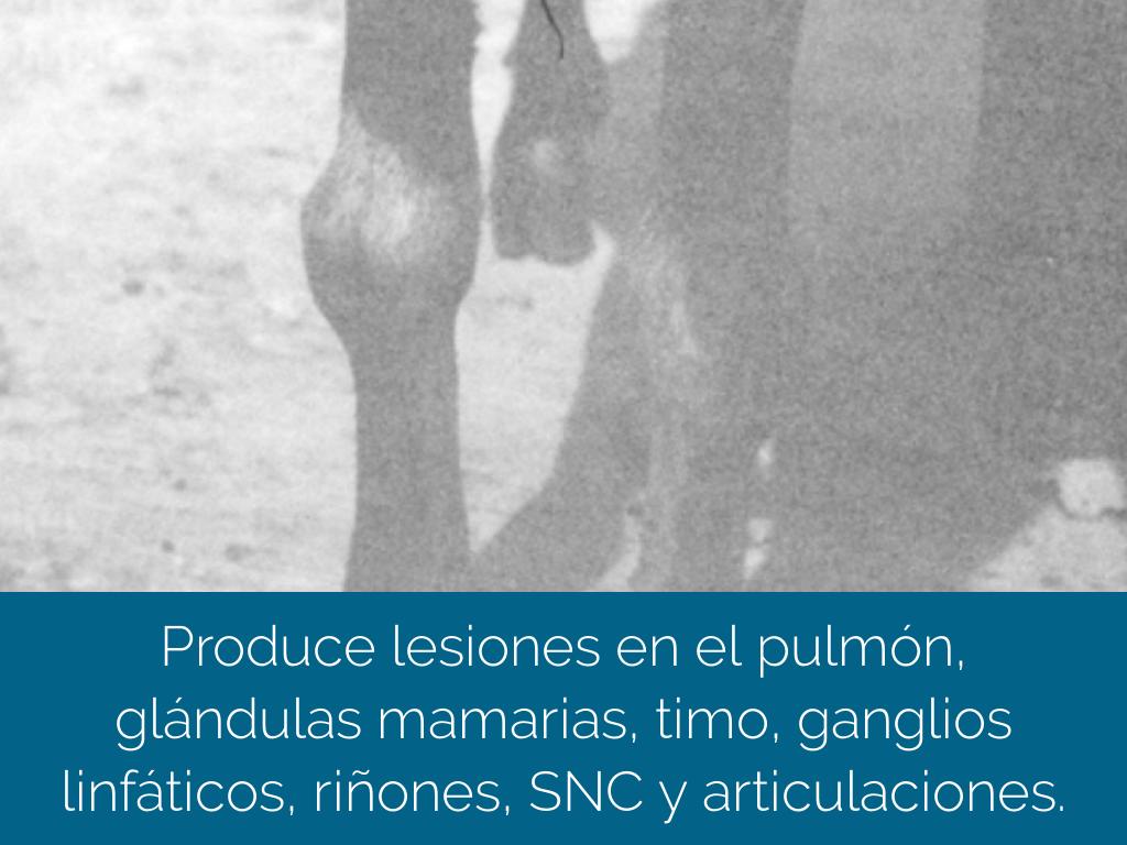 Produce lesiones en el pulmón, glándulas mamarias, timo, ganglios linfáticos, riñones, SNC y articulaciones.