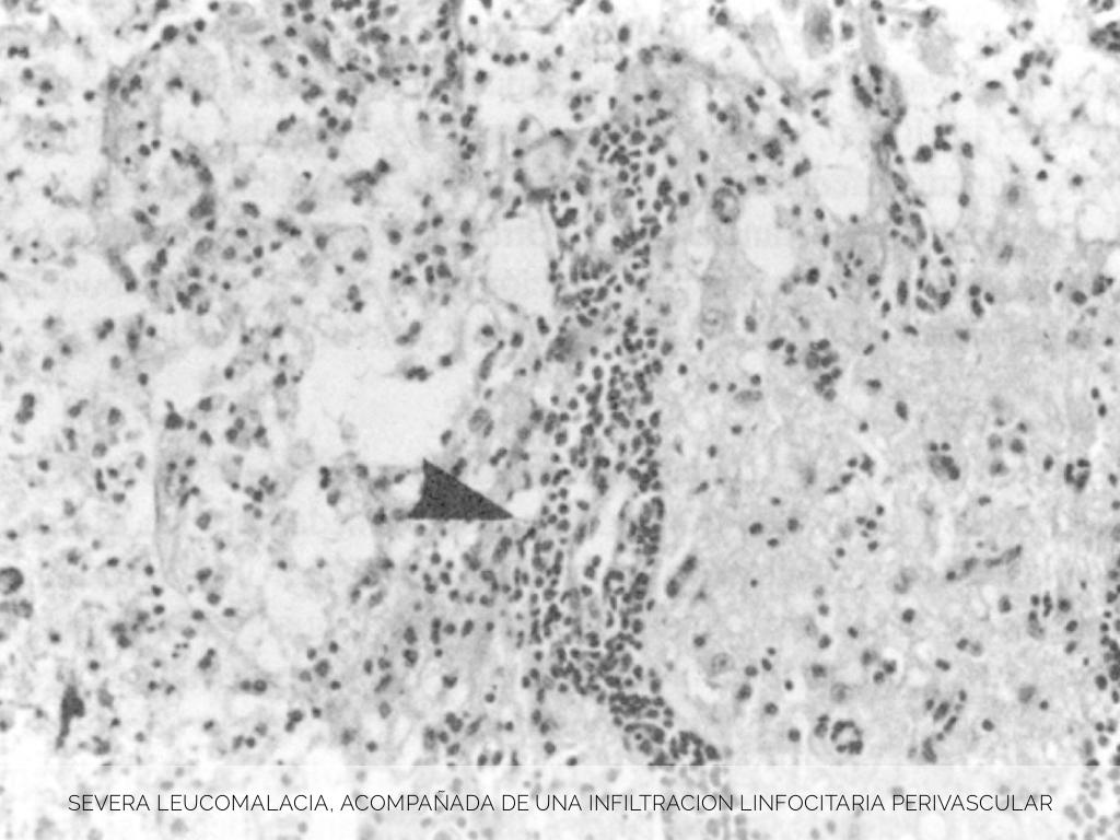SEVERA LEUCOMALACIA, ACOMPAÑADA DE UNA INFILTRACION LINFOCITARIA PERIVASCULAR