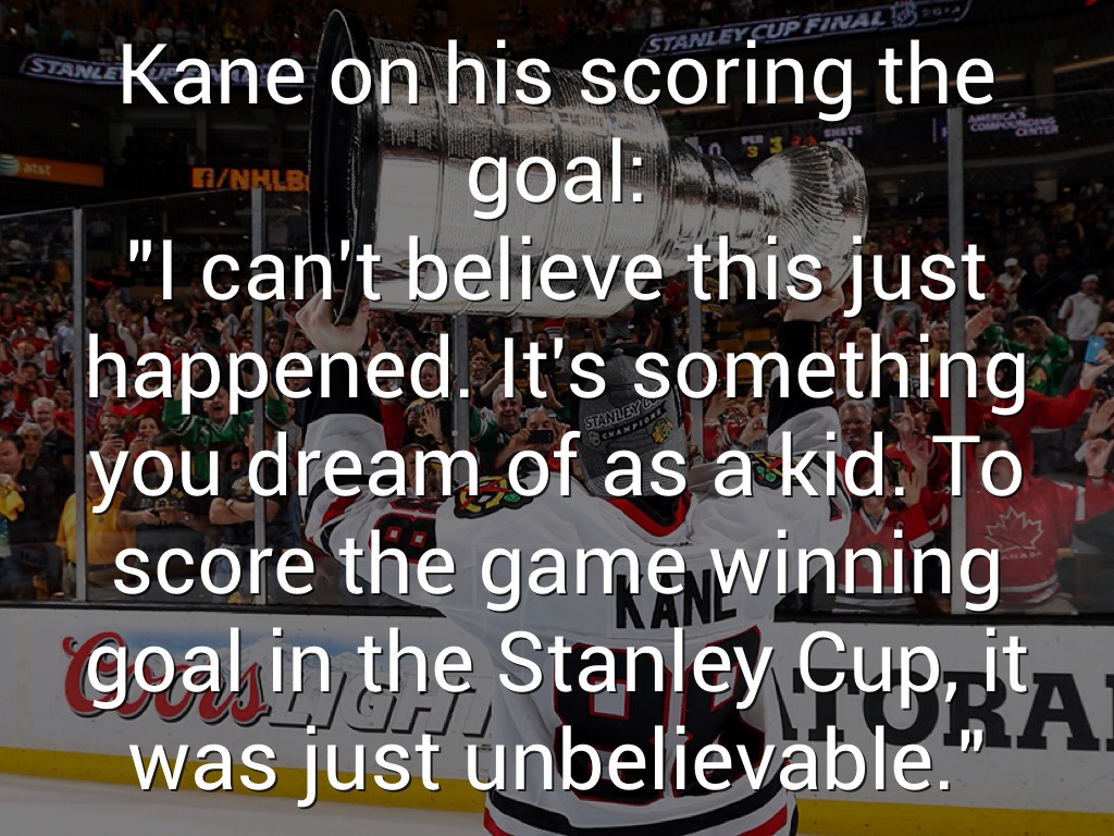 "I can't believe this just happened. It's something you dream of as a kid. To score the game winning goal in the Stanley Cup, it was just unbelievable."