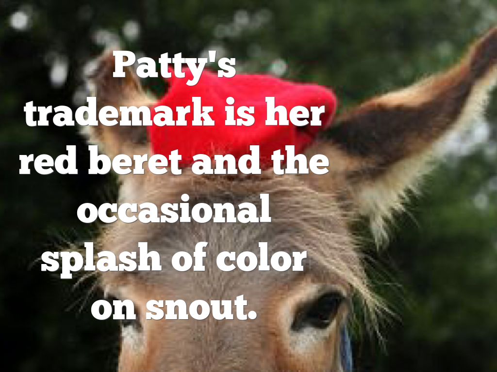 You know how to find Patty by her trademark, a red beret and the occasional splash of color on snout.