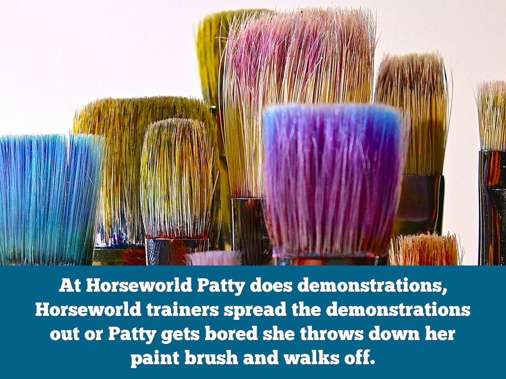 At Horseworld Patty does demonstrations, the trainers spread them out over the week or Patty gets bored and throws down her paint brush and walks off.