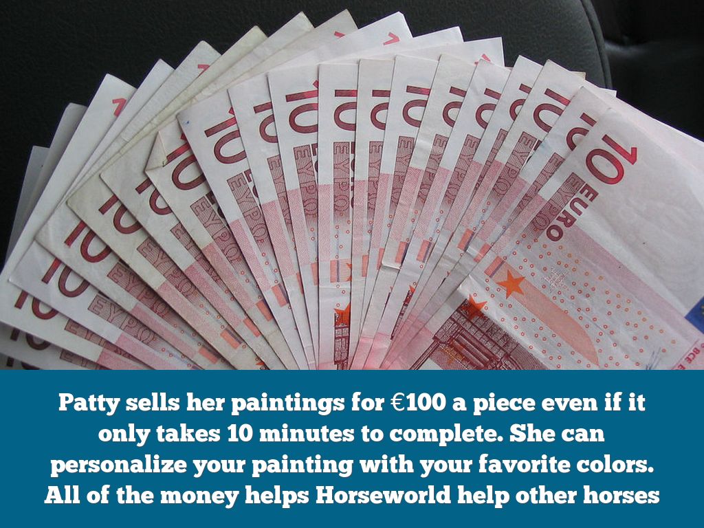 Patty sells her paintings for €100 a piece even if it only takes 10 minutes to complete. She can personalize your painting with your favorite colors. All of the money goes Horseworld to help other horses.