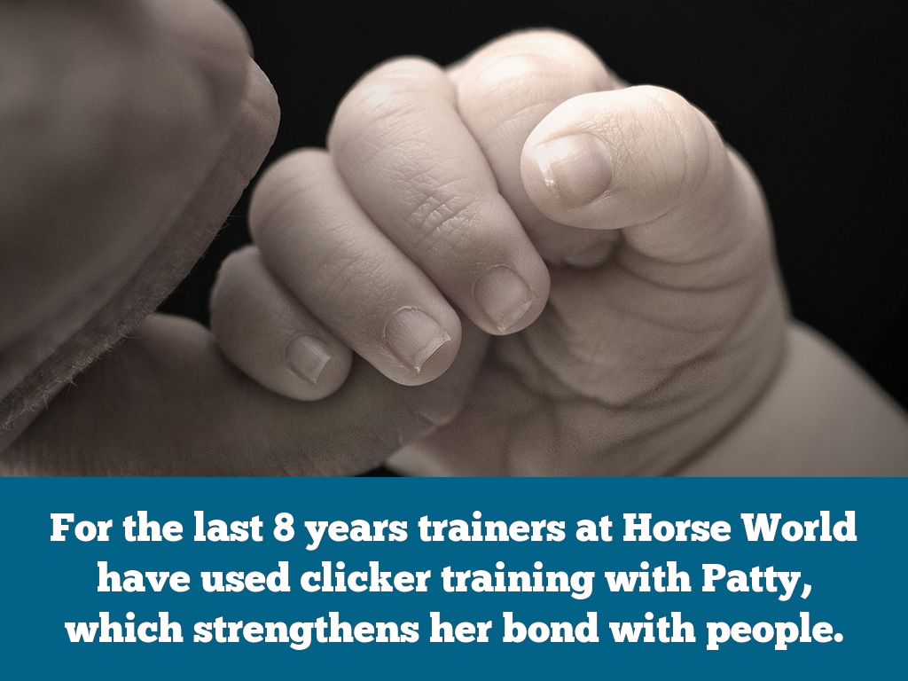 For the last 8 years trainers at Horse World have used clicker training with Patty, which strengthens her bond with people.