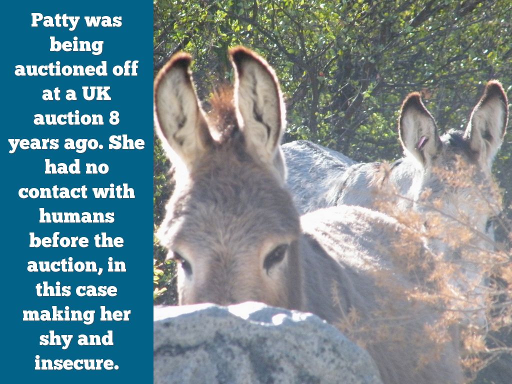 Patty was being auctioned off at a UK auction 8 years ago. She had no contact with humans before the auction, in this case making her shy and insecure.