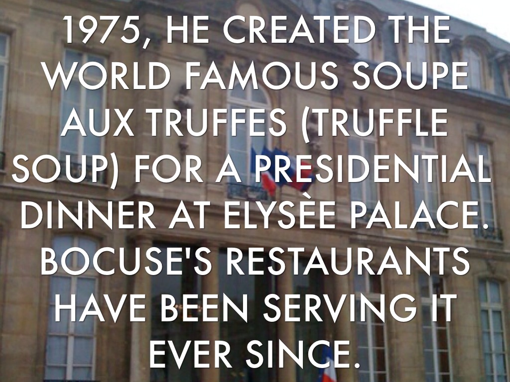 1975, HE CREATED THE WORLD FAMOUS SOUPE AUX TRUFFES (TRUFFLE SOUP) FOR A PRESIDENTIAL DINNER AT ELYSÈE PALACE. BOCUSE'S RESTAURANTS HAVE BEEN SERVING IT EVER SINCE.